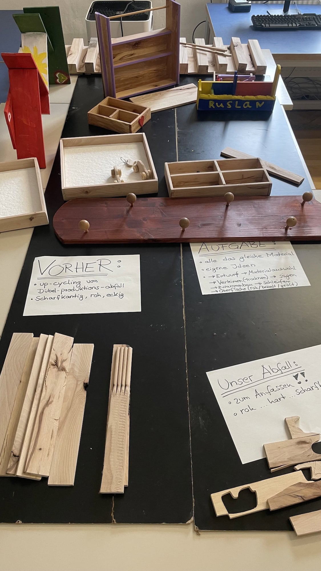 Aus einfachen Reststücken einer Dübelproduktion – schmale Holzleisten mit den Maßen 30 x 5 cm x 5 mm – sollten nützliche und kreative Alltagsgegenstände entstehen.